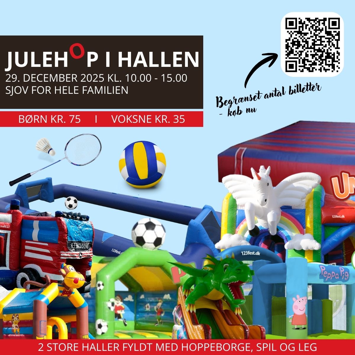 Hallen forvandles til et paradis af hoppeborge i alle størrelser, klar til timevis af sjov.