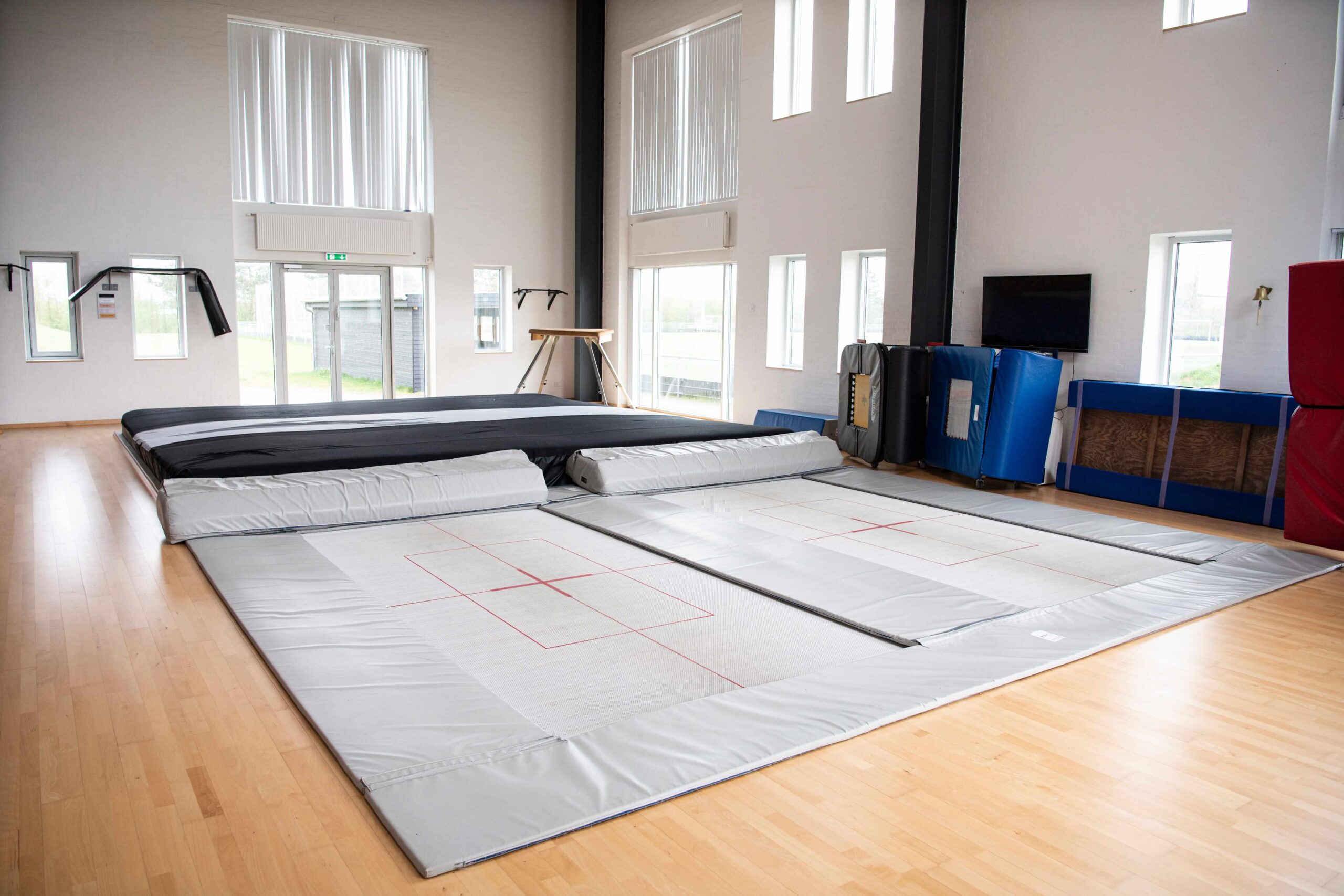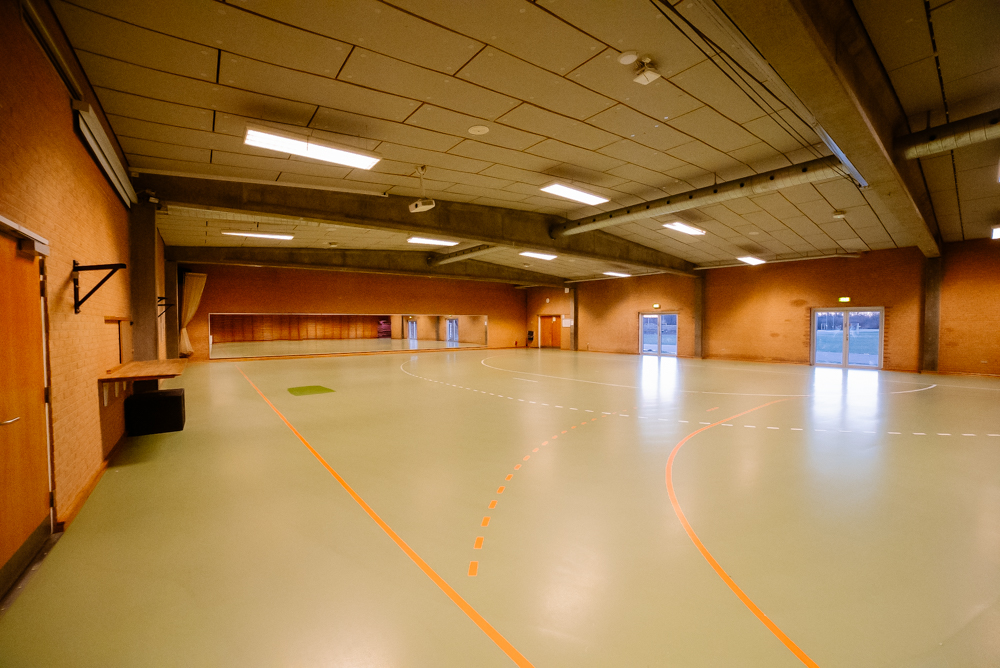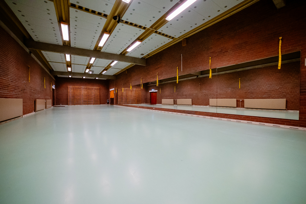 Hallen har spejlvæg og lydanlæg.