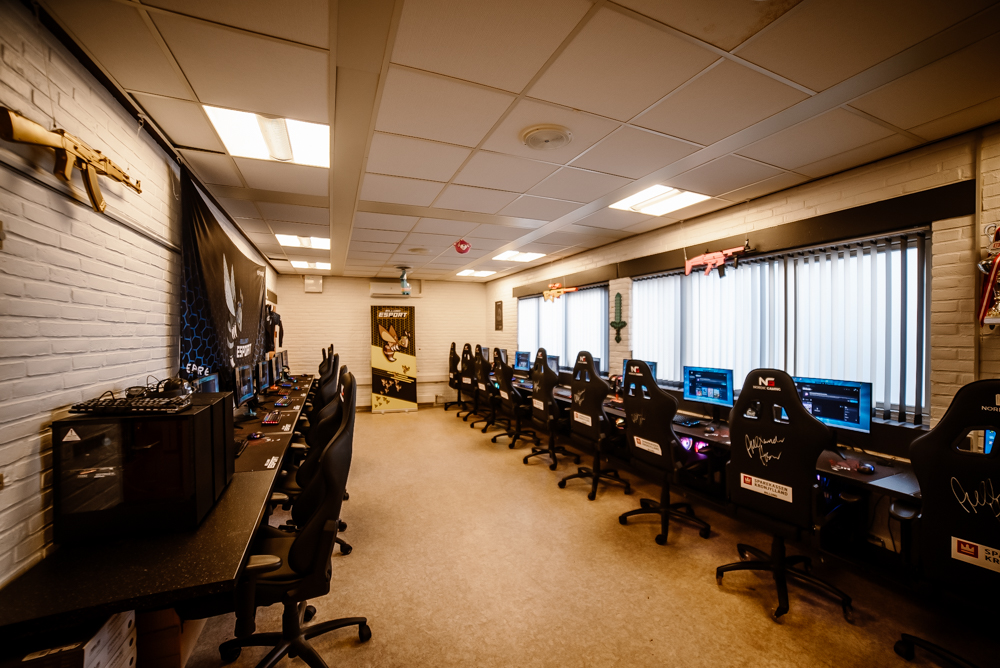 Et dedikeret e‑sport‑lokale med moderne udstyr, hvor gamers kan spille alene eller sammen.