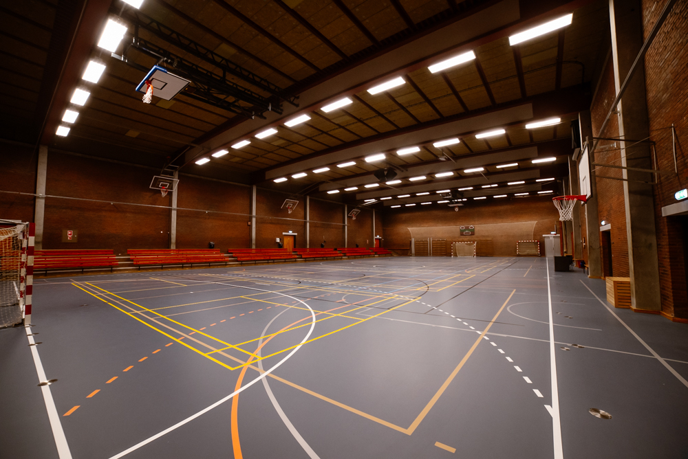 Hallen der har plads til max 1.146 personer har tilskuerpladser, dommerbord og musikanlæg.